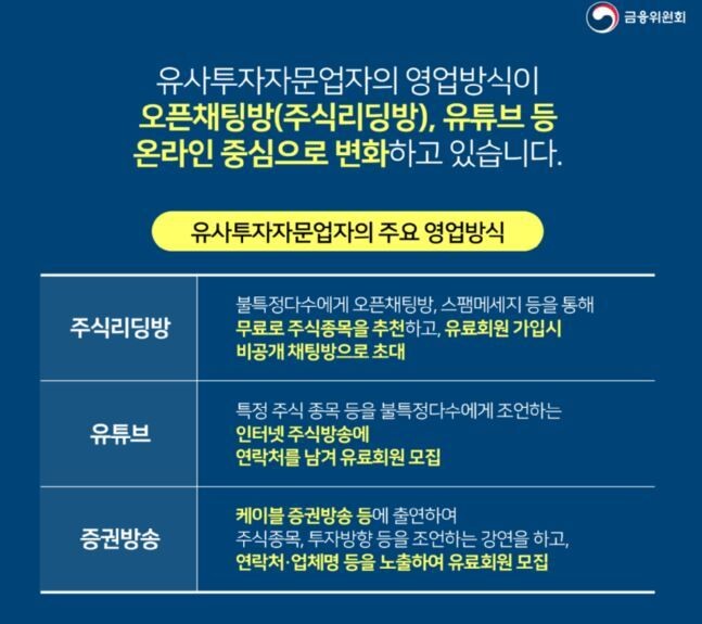 유사투자자문업체는 인터넷 카페나 주식방송 등을 통해 불특정 다수 투자자에게 회비를 받고 투자정보를 제공하는 이들이다. 유사투자자문업체가 투자자문업체처럼 일대일 상담을 해주는 것은 불법입니다. 하지만 유사투자자문업자들은 오픈채팅방, 스팸메시지 등을 통해 무료로 주식 종목을 추천하고, 유료가입을 유도한 뒤 비공개 채팅방에서 일대일 자문을 해왔다고 해요.