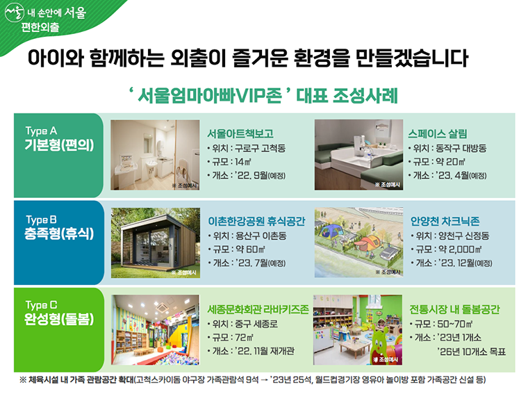 예컨대, 한강공원이나 DDP 같은 다중이용시설에는 잠시 머무르면서 마음껏 쉴 수 있는 개방형 휴식공간을, 세종문화회관 등 문화시설과 전통시장에는 아이를 잠시 맡기고 공연을 보거나 장을 볼 수 있도록 돌봄서비스까지 제공하는 시설로 조성한다.