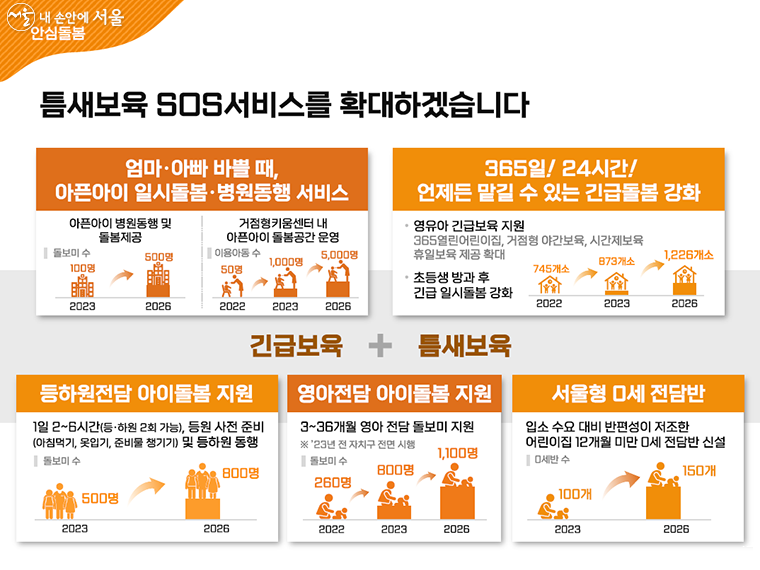 이와 함께 365일 24시간 긴급보육을 강화한다. 거점형 야간보육, 시간제보육 어린이집 등 ‘긴급돌봄 제공기관’을 현재 745개소에서 2026년까지 1,226개소로 확대한다. 놀이와 돌봄을 모두 지원하는 ‘서울형 키즈카페’는 2026년까지 동별 1개꼴인 400개소로 확대한다.