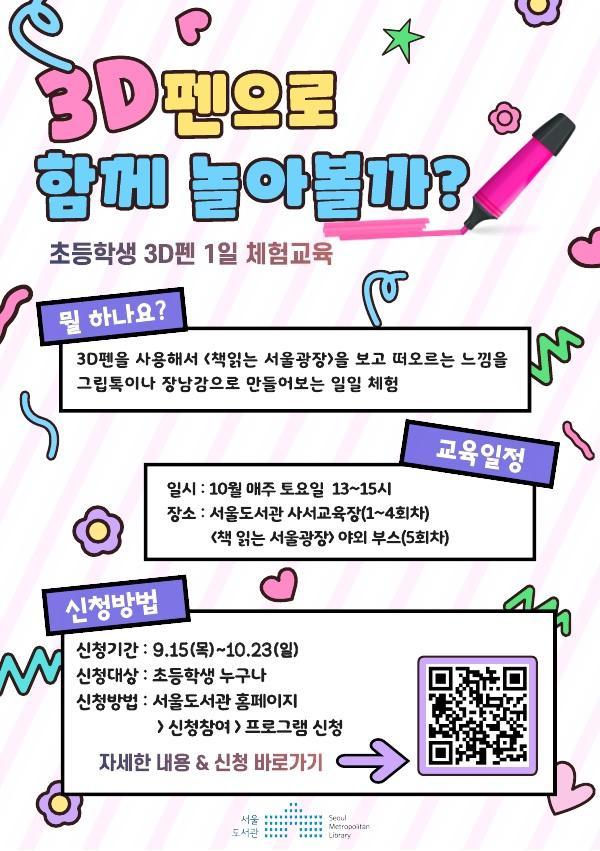 서울 도서권에서 10월 한달 간 매주 토요일마다 초등학생을 대상으로 3D펜 체험교육을 실사합니다.