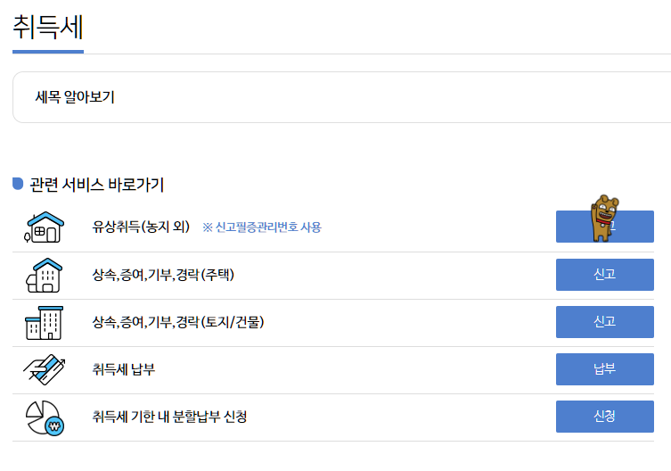 우측 하단 지방세 바로가기에서 취득세를 선택하시면 됩니다.