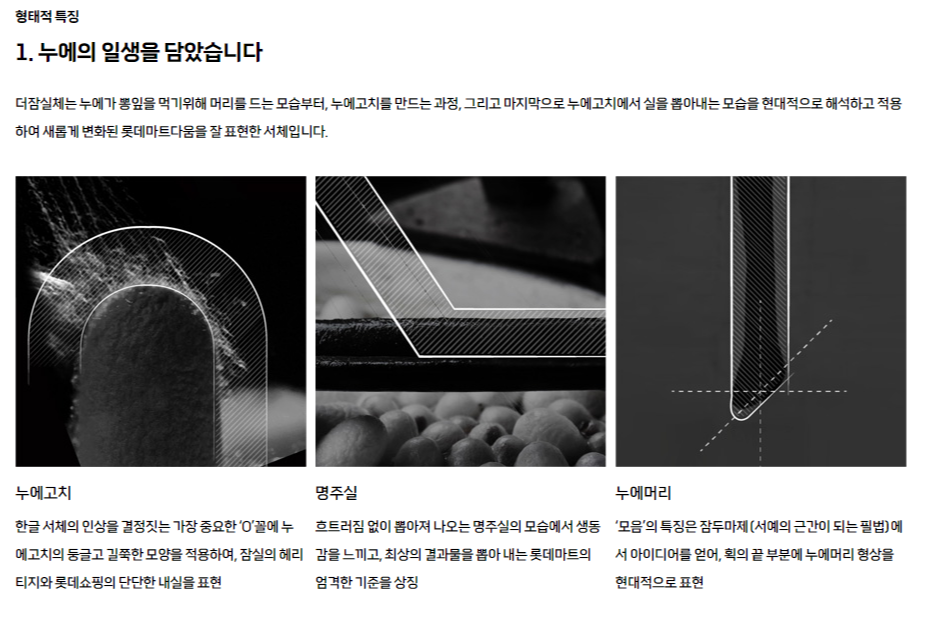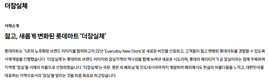 롯데마트는 기존의 노후화된 브랜드 이미지를 탈피하고자 22년 ‘Everyday New Store’로 새로운 비전을 선포하고, 고객들이 젊고 변화된 롯데마트를 경험할 수 있도록 서체개발을 진행했습니다. ‘더잠실체’는 롯데마트 브랜드 이미지와 잠실지역의 역사성을 함께 녹여낸 새로운 시도이며, 롯데의 헤리티지가 곧 잠실이라는 점에 주목하여 지역명 ‘잠실’을 서체의 이름으로 선정하였습니다. ‘더잠실체’는 국문, 영문 외 베트남 및 인도네시아어까지 개발하여 해외에서도 한글의 아름다움을 느끼고, 대한민국을 대표하는 지역으로서의 ‘잠실’을 알리는 것을 최종 목표로 하고있습니다.