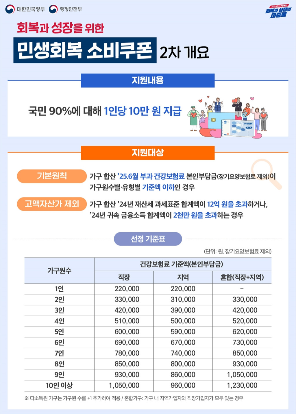 2차 민생지원금의 가장 중요한 점은 **소득 상위 10%를 제외한 국민 90%**에게 지급된다는 것입니다. 행정안전부는 과거 '국민지원금' 지급 당시와 마찬가지로 가구별 건강보험료를 주요 기준으로 삼았습니다.