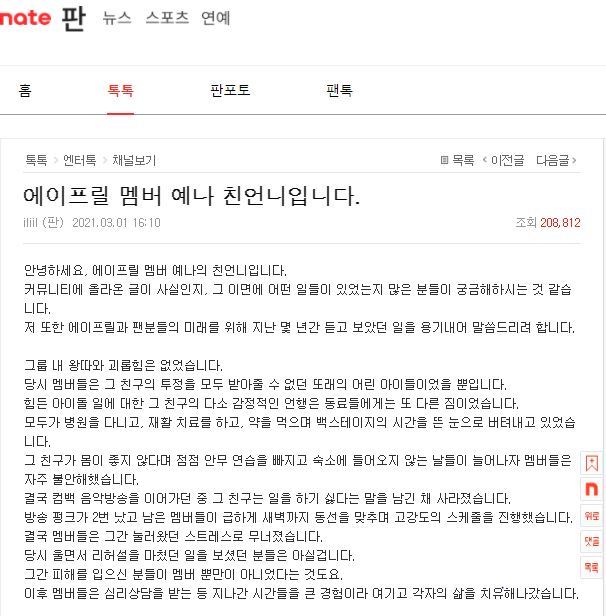 이같은 상황에 에이프릴 멤버 예나의 친언니 C씨도 반박글을 올렸습니다. 어제(1일) 오후 온라인 커뮤니티에 C씨는 "그룹 내 왕따와 괴롭힘은 없었다. 당시 멤버들은 그 친구의 투정을 모두 받아줄 수 없던 또래의 어린 아이들이었을 뿐"이라고 논란에 선을 그었습니다.