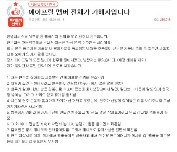 이같은 주장에 이어 어제(1일) 이현주의 친구라고 밝힌 B씨도 온라인 커뮤니티에 '에이프릴 멤버 전체가 가해자입니다'라는 제목으로 글을 올렸습니다. B씨는 "당시 에이프릴 모든 멤버가 현주를 왕따 시켰다. 가해자만 있었을 뿐 방관자는 없었다"라고 강조했습니다.